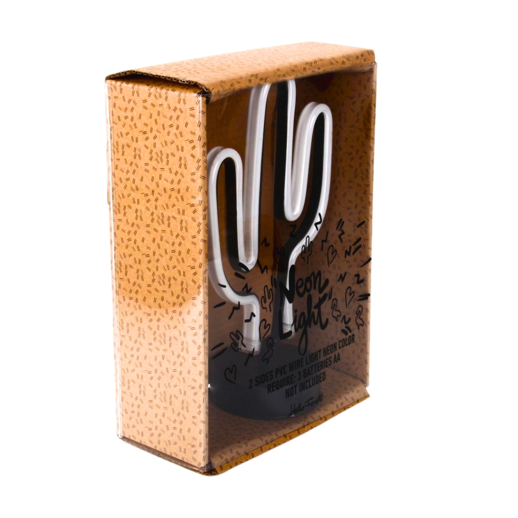 La lámpara de neón con forma de cactus es una tendencia decorativa que aporta un toque de originalidad y diversión a cualquier espacio. Esta lámpara utiliza tecnología LED para imitar el efecto del neón tradicional, ofreciendo una iluminación llamativa con un consumo energético reducido. Es perfecta para añadir un ambiente acogedor y moderno a tu habitación o sala de estar. Con la alimentación por baterías, esta lámpara de neón es versátil y fácil de instalar en cualquier lugar que desees. Características: botón de encendido ON/OFF, funciona con 3 pilas AA no incluidas. Material: metal, LEDs, PVC, termoplástico con soldadura de alta frecuencia (HF).