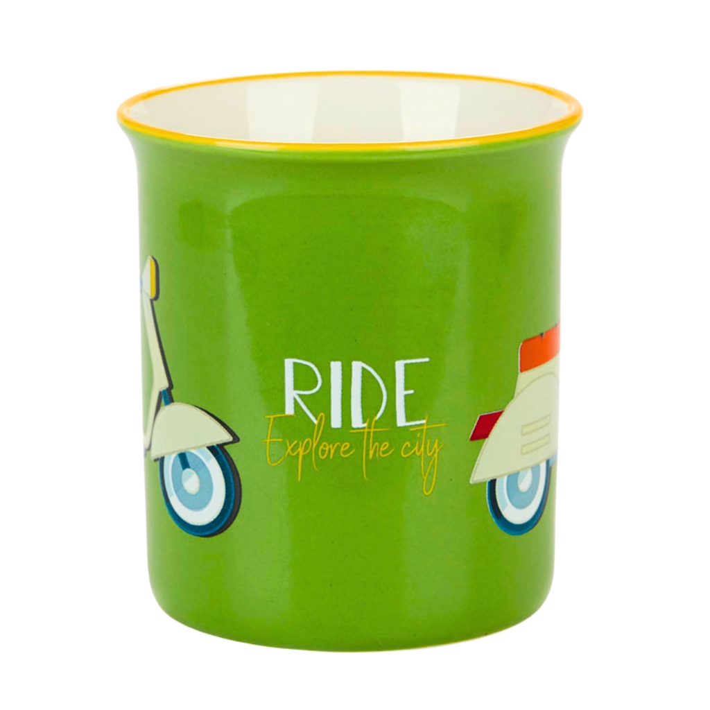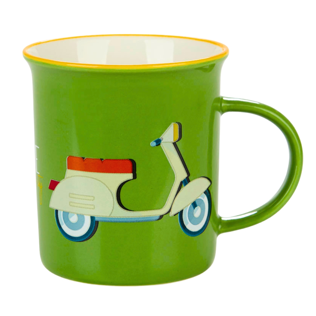 La taza de cerámica con su vibrante color verde y diseño vintage inspirado en la Vespa, es más que un simple recipiente para tu bebida favorita. Es una invitación a explorar la ciudad con el espíritu aventurero de los años 80. Cada sorbo es un recordatorio de que la vida está llena de viajes esperando ser descubiertos. Resistente al calor y apta para el uso diario, esta taza captura la esencia de la libertad y la diversión. ¡Es el regalo ideal para quienes aman la emoción de un nuevo viaje, ya sea en moto o a través de las historias que cada taza de café puede contar! Características: cerámica de alta calidad resistente al calor, apta para lavavajillas y microondas. Material: cerámica.